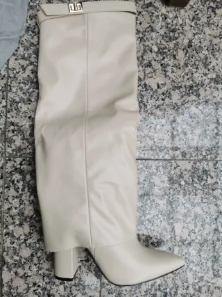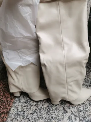 SOLO ENVIO Botas altas de estilo pantalón en color beige. El diseño presenta un detalle de hebilla en la parte superior Tida la bota mide 49 cm, nuevas sin uso en su caja, 39 tallan muy pequeñas. PRECIO NO NEGOCIABLE - Tacón cuadrado.11 cm - Punta afilada. - Material sintético.