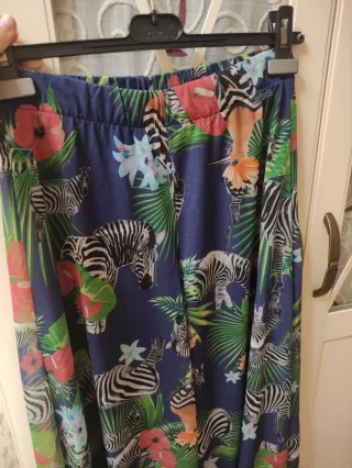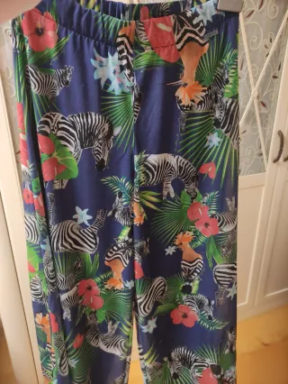 Pantalón ancho, con estampado vegetal alegre y cebras, de la marca Amarillolimon. Es un pantalón fresquito para verano, con forro interior. Sin bolsillos laterales. Muy combinable por sus colores. Talla 1. Está en buen estado. Comprado en su momento por app.