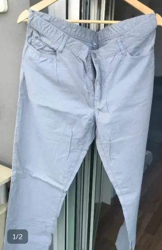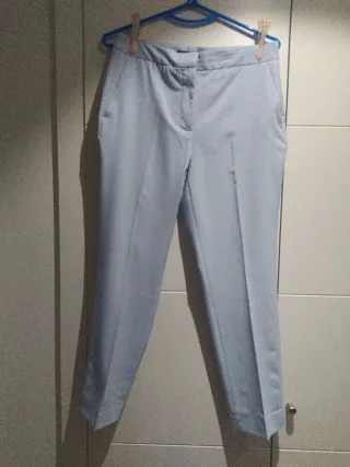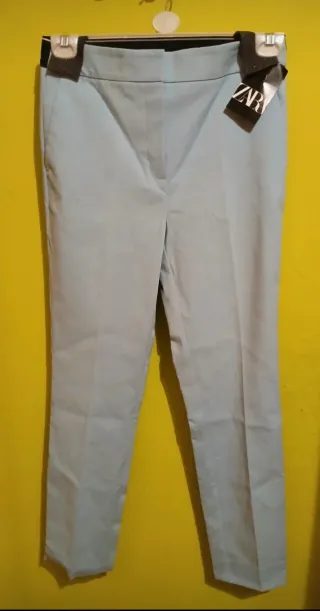 Pantalón de vestir de la marca Zara. Nuevo, con etiqueta. - Talla: M - Color azul claro/celeste. - Goma elástica en zona trasera. - Corte: pitillo. - 100% Algodón. - Doble sistema de cierre (clic metálico + botón interior).