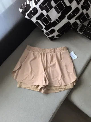 Pantalón corto de mujer, ideal para yoga o deporte. Confeccionado en un suave tejido beige. - Cintura elástica. - Diseño de doble capa. -Tengo 4 piezas. -El precio va por pieza.