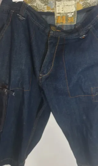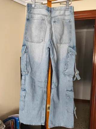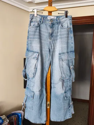 Pantalón vaquero de la marca Bershka. - Diseño tipo cargo con múltiples bolsillos. - Cierre de cremallera y botón. - Costuras reforzadas.