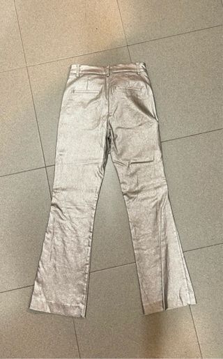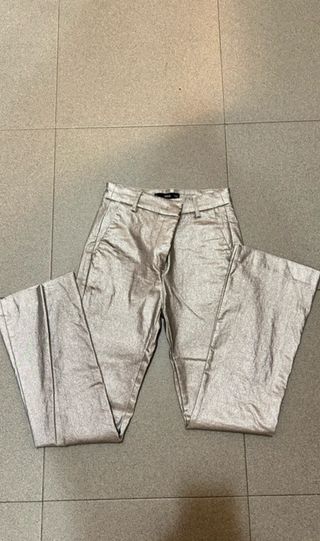 Pantalón de vestir Mango en color plateado. Diseño elegante y moderno. - Corte recto. - Cierre de cremallera y botón. - Bolsillos delanteros.
