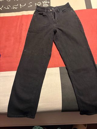 Pantalón vaquero largo de color negro. Diseño moderno y versátil. - Cintura alta. - Cierre de cremallera y botón. - Bolsillos delanteros y traseros.
