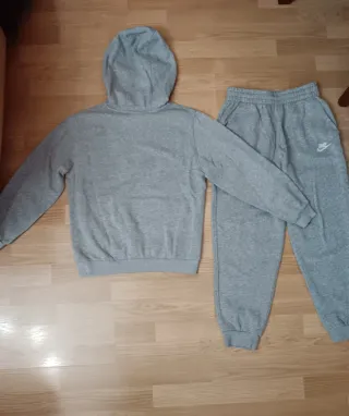 Chándal Nike original para niño, color gris, talla L. Incluye sudadera y pantalón a juego. En muy buen estado, sin rotos ni manchas. Ideal para uso diario, colegio o deporte. Entrega en mano o envío