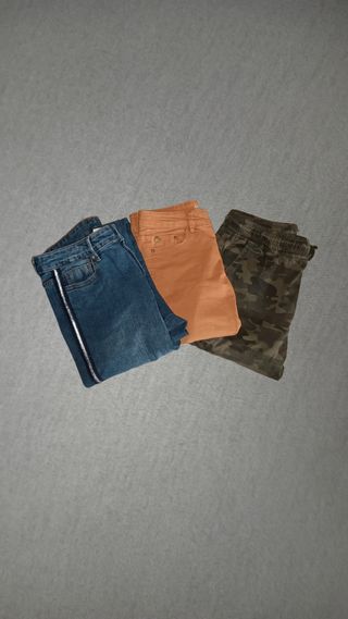 3 pantalones de niña/o en muy buenas condiciones, apenas usados. Pantalón azul vaquero de Lefties talla 34. Pantalón verde talla 11/12 de In Extenso. Pantalón rosa claro talla 11/12 de DMB. Los tres pantalones por 8€, uno individual 3€.