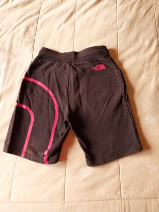 Pantalones cortos para niño de la marca The North Face. Son de color negro con detalles en rosa. - Están en buen estado. - Ideales para actividades al aire libre o uso diario.