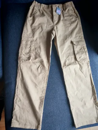 Vaqueros de corte ancho y estilo cargo, perfectos para el día a día. - Cintura elástica ajustable. - Bolsillos laterales de cargo. - Diseño loose fit. La etiqueta de la prenda de H&M de la imagen indica que es un pantalón de corte holgado (Loose Fit) con cintura ajustable y pernera recta (Straight Leg). Sin apenas uso, en perfecto estado. Color negro y de cremallera. Cómodos niños 12-13 años talla EUR.15.8