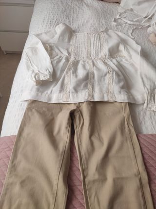 pantalón tipo chino beige y blusón blanco roto