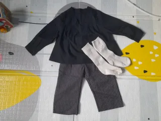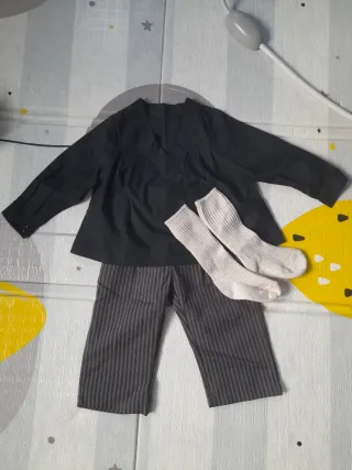Conjunto traje caserito para niño (1-2 años). - Camisa negra. - Pantalón gris a rayas. - Par de calcetines blancos.