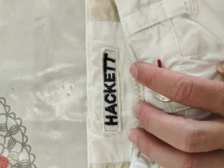 Conjunto de dos pantalones cortos para niño del corte inglés y de la marca HACKETT - Pantalón azul con cintura elástica y detalles blancos. - Pantalón blanco con vuelta en el bajo y detalles rojos.
