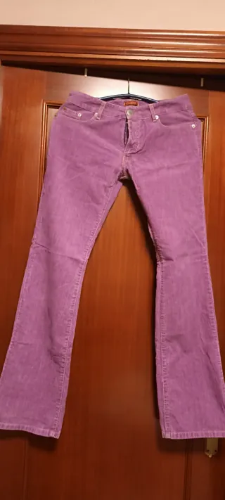 Pantalón de pana de corte acampanado. - Color morado. - Diseño de cinco bolsillos. - Cierre de cremallera y botón.