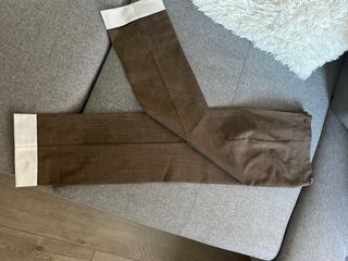 Pantalón chino para niño en color camel. Diseño clásico y cómodo. - Cierre de botón y cremallera. - Bolsillos delanteros y traseros. Son dos pantalones iguales talla 15-16 marca unir de Hipercor, un pantalón 8€ y si te llevas los dos 15 € utilizado para uniforme Lope de Vega