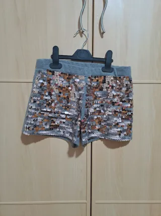 Shorts grises con un diseño llamativo de lentejuelas. -T/14,157cm. - Cintura elástica para mayor comodidad. - Lentejuelas en tonos plateados, dorados y rosados.