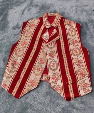 Conjunto de traje fallero para niño de 4 años sin estrenar. Incluye chaleco, fajín y pantalón. - Chaleco con estampado geométrico en tonos dorados y rojos. - Fajín de color rojo. - Pantalón de color granate.