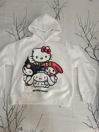 Pantalón de chándal blanco con estampado de Hello Kitty y sus amigos. - Diseño de pierna ancha. - Estampado de personajes en la parte inferior de la pierna. - Detalle de Hello Kitty y texto en la parte superior. Sudadera de chándal de Hello Kitty y sus amigos - Estampado de los personajes en la parte de delante - Estampado en la parte trasera inferior de la sudadera.