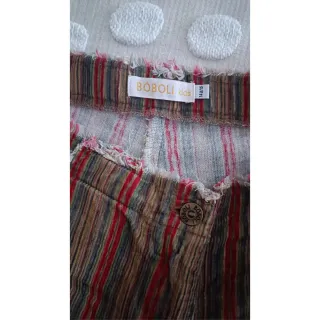 Pantalón de pana con un diseño a rayas verticales en tonos marrones y rojos. El bajo y los bolsillos tienen un acabado deshilachado. - Diseño a rayas. - Tiene goma y botón en la cintura para ceñir a la cintura de cada uno - Equivale a una 36 de adulto o incluso 38