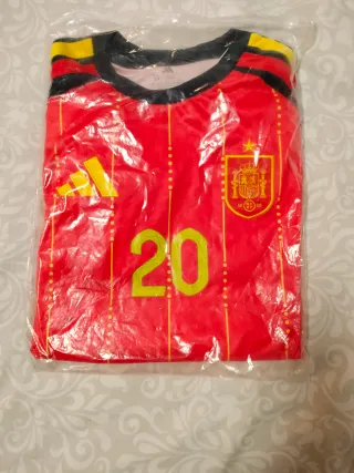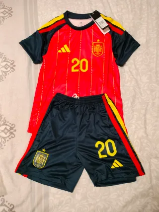 Conjunto compuesto por camiseta y pantalón actual de la selección española de fútbol para niño. - Diseño con los colores rojo y mangas azules. - Número 20 y nombre de Pedri. - Talla 24 (para niños).