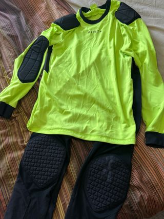Conjunto de equipación de portero con camiseta y pantalón, para niño, en la talla 12 - Camiseta de manga larga en color verde lima. - Pantalón largo en color negro. - Protecciones acolchadas en hombros, codos y rodillas.
