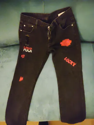 Pantalón vaquero para niño con un diseño moderno y llamativo. - Parche de rosa roja en la pierna derecha. - Inscripción LOVE FUCK en la pierna izquierda. - Detalle de LUCKY en la pierna derecha. - Pequeños parches decorativos adicionales.
