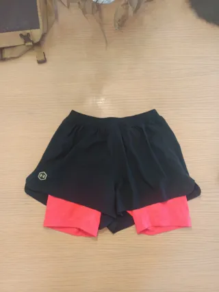 Pantalón corto deportivo de dos capas, ideal para actividades físicas. - Capa exterior negra. - Capa interior en color rosa vibrante. - Detalle de logo en la parte lateral.