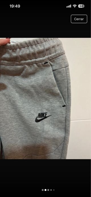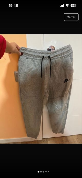 Pantalón deportivo Nike Tech para niño. - Color gris jaspeado. - Cintura con cordones negros. - Bolsillo lateral con cremallera negra. - Logo de Nike en negro en la pierna izquierda. - tiene un desgaste entre pierna se puede reparar con enganchina de plancha
