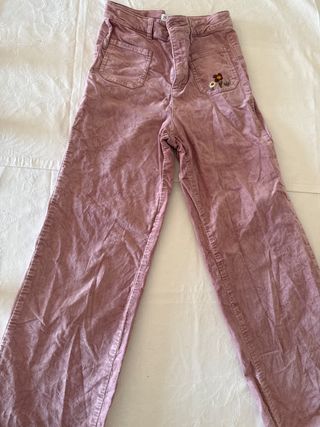 Pantalón de pana en color rosa, ideal para niñas de 13 a 14 años. Presenta un diseño moderno y cómodo. - Cintura alta. - Pierna ancha. - Bolsillos delanteros y traseros. - Detalle bordado de flores en el bolsillo derecho.