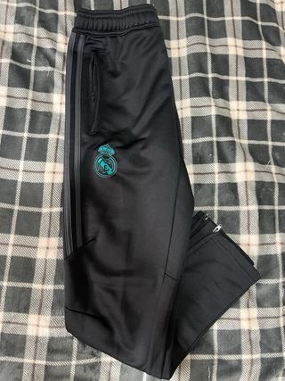 Pantalones deportivos de Adidas con el escudo del Real Madrid. - Diseño clásico con las tres franjas laterales. - Color negro. -Cremalleras en la zona trasera que permiten abrir el pantalón (ver foto)