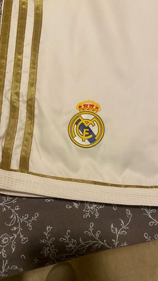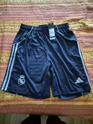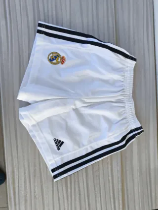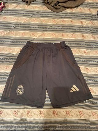 Pantalones cortos deportivos del Real Madrid. Nunca se han usado pero no tienen etiqueta porque la tiene solo la camiseta -Pantalones con bolsillos y cremallera - Diseño en color gris. - Logo del Real Madrid en la pierna izquierda. - Logo de Adidas en la pierna derecha. - Tres rayas deportivas en los laterales. -también se vende con la camiseta