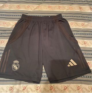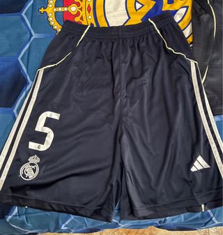 Pantalones cortos de entrenamiento del Real Madrid. - No se han usado pero no tienen etiqueta porque venia solo con la camiseta - Diseño en color azul marino. - Detalles de las tres rayas de Adidas en los laterales. - Número 5 y escudo del club impresos en la pierna. - Logo de Adidas en la otra pierna.
