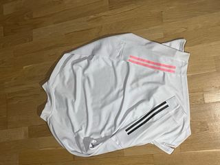 Conjunto deportivo del Real Madrid. - Camiseta blanca con detalles rosas. Talla S. - Pantalón corto blanco con detalles rosas. Talla M.