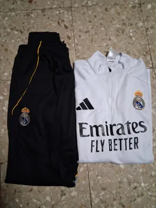 Conjunto de chándal del Real Madrid. - Parte superior blanca con detalles grises y amarillos. - Pantalón negro con detalles blancos y amarillos. Talla S y L