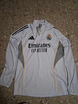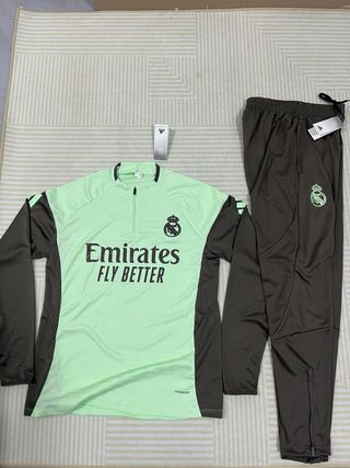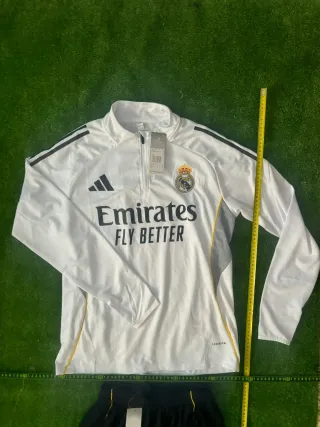 Conjunto de chándal oficial del Real Madrid, temporada 2025/2026, compuesto por chaqueta y pantalón. - Chaqueta con cierre de cremallera completa. - Pantalón con cintura elástica. - Diseño deportivo con detalles característicos del club y la marca. Lo vendo porque me he equivocado de talla No negociable el precio
