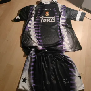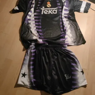 Conjunto oficial de camiseta y pantalón corto del Real Madrid de la temporada 1997-1998. 9 suker - Diseño con detalles en morado y blanco. - Logo de Teka en la camiseta. - Escudo del Real Madrid. - Licencia Kelme.