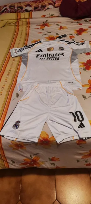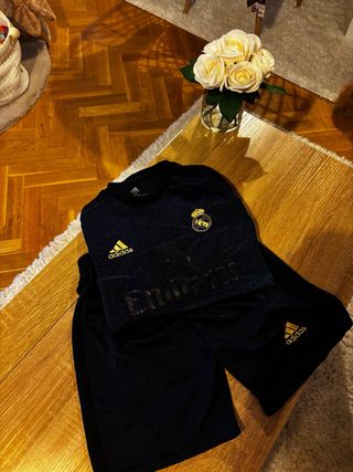 Conjunto deportivo del Real Madrid, talla M. Incluye camiseta y pantalón corto. - Camiseta con dorsal y nombre de Valverde. - Pantalón corto con dorsal. - Diseño con detalles en negro y dorado.