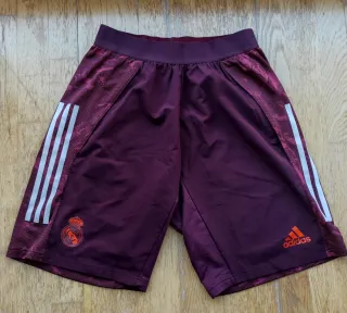 Pantalón corto del Real Madrid. - Diseño en color burdeos con detalles en blanco. - Logo del Real Madrid en la pierna derecha. - Logo de Adidas en la pierna izquierda . - Bolsillos con cremallera.