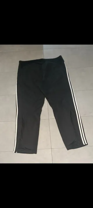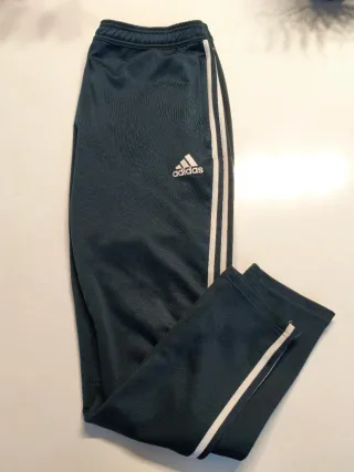 Pantalón deportivo del Real Madrid. - Diseño con las tres rayas características de Adidas en los laterales. - Escudo del Real Madrid bordado en la pierna izquierda. - Logo de Adidas bordado en la pierna derecha. - Cintura elástica con cordón para un ajuste cómodo. - Bolsillos laterales con cremallera - Talla 11-12 niño(152cm) - Mido 153cm y me quedan bien de largo - Tela Chubasquera/plastico