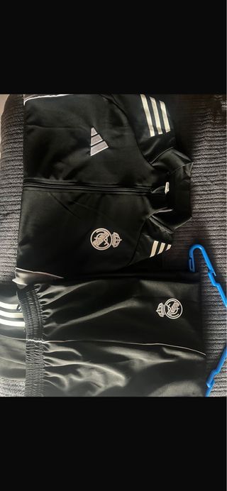 Conjunto de chándal del Real Madrid. - Chaqueta con cremallera completa. - Pantalón con detalles de rayas. - Logos de Adidas y del club.se vende x perdida de ticket,y es original ,negociables