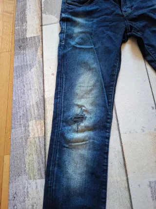 Pantalón vaquero de la marca Salsa en talla XS. Presenta un diseño moderno con rotos y detalles desgastados. - Corte recto. - Lavado oscuro con efecto desgastado. - Detalles de rotos y salpicaduras blancas.