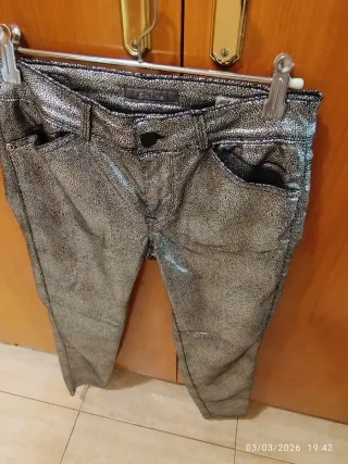 Pantalón de la marca Salsa, con un llamativo acabado plateado que imita la piel. Solo se ha usado una vez, por lo que se encuentra en excelente estado. - Diseño con efecto piel. - Color plateado brillante.