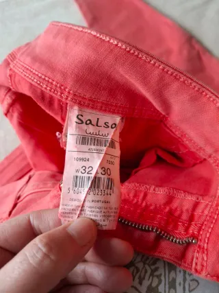 Pantalón de mujer de la marca Salsa, ideal para la temporada de primavera. Su diseño moderno y color vibrante lo hacen una prenda versátil. - Corte favorecedor. - Detalle de bolsillos, en el bolsillo derecho trasero el hilo plateado tiene un pequeño defecto tal como se muestra en la foto. - Tejido cómodo y ligero. - La talla según la marca salsa es una 37