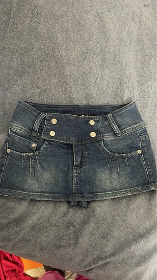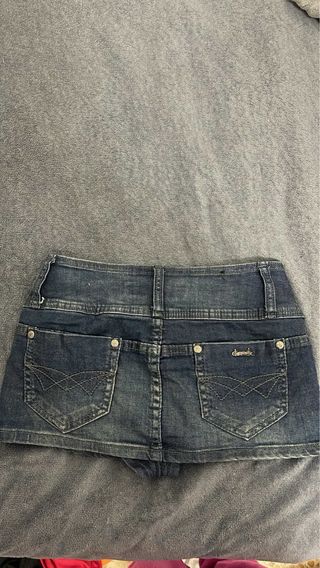 Falda vaquera corta con diseño de pantalón integrado. Es una prenda versátil y moderna. - Cintura alta con doble abotonadura. - Bolsillos delanteros. - Detalle de pedrería en bolsillo.