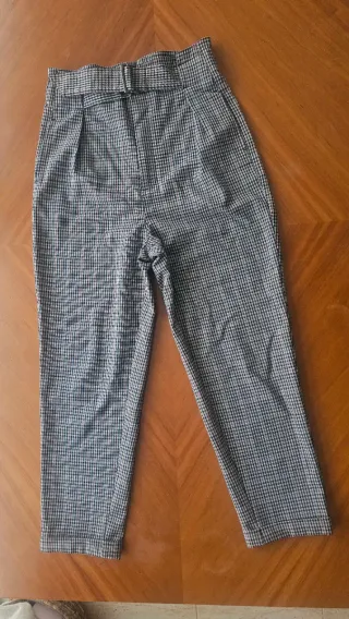 Pantalones de vestir con un diseño de cuadros. - Cintura con trabillas para cinturón. - Incluye cinturón a juego. - Talla 36 correcta. Queda muy bien porque son Push up y se ajusta a la cintura. En perfecto estado.