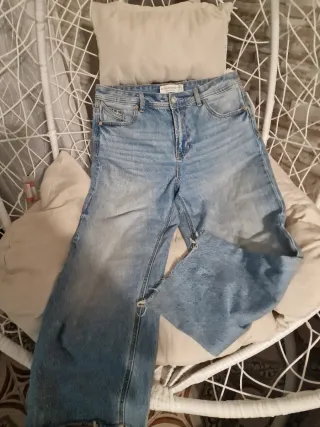 Tejanos de Stradivarius, talla 38. Corte recto. Se venden porque tienen un par de roales blanquecinos en el tejido, como podéis ver en las imágenes. Por lo demás están bien. Medidas: Ancho cintura: 36cm Ancho cadera: 44cm Largo: 110cm