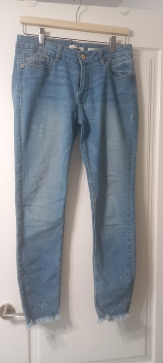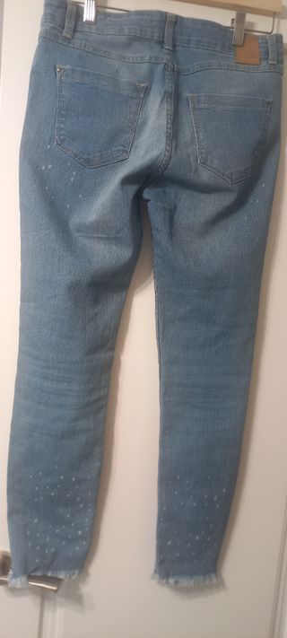 Pantalo skinny de Stradivarius.Azul con manchitas blancas a modo de decoracion y tambien tiene el bajo deshilachado.Es algo elastico.