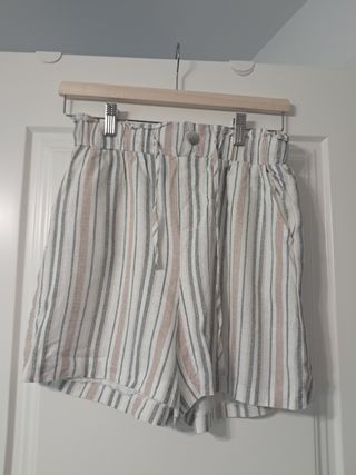 Preciosos shorts de verano de Stradivarius. Ideales para tus días de calor porque son muy fresquitos. - Están en perfecto estado. - Cierre con botón y cordón. - Diseño de rayas multicolor. - Tiene goma en la cintura. - Y cuenta con dos bolsillos laterales.