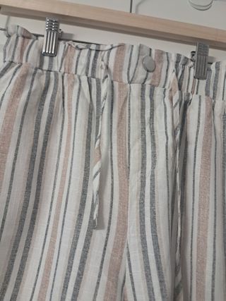 Pantalones largos con un diseño de rayas verticales. - Cintura elástica. - Bolsillos laterales. - Bajo con vuelta. ( Esta cosido y metido de los lados de la cintura )