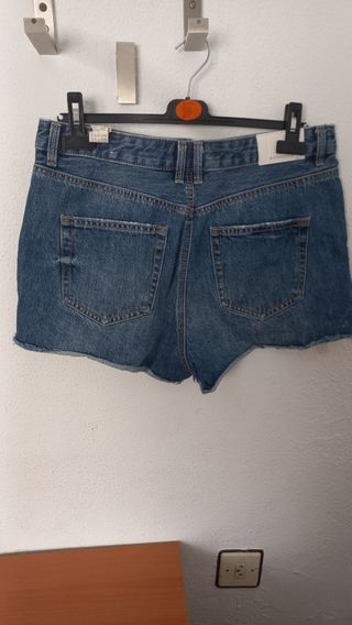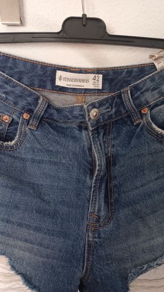 Preciosos shorts de la marca Stradivarius, talla 42 (equivalente a una US 10 o UK 14). Son de color azul y presentan un estilo desgastado que les da un toque moderno. - Tienen un corte clásico. - Confeccionados en tejido denim. - Ideales para el verano.