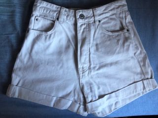 Pantalones cortos, color blanco, con botones plateados, bolsillos delanteros y traseros. Talla 36 Stradivarius.