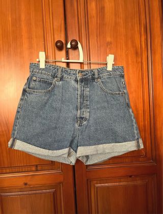 Bonitos vaqueros cortos de stradivarius color azul, con un total de 4 botones, del modelo MOM, se encuentra en perfecto estado, lo único que el dobladillo de la parte de atrás ha perdido un poco la forma, pero por lo demás está nuevo.Es talla 40 y quedan ideales en estas fechas🥰