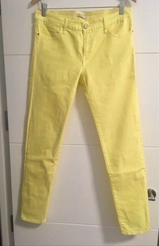 Pantalón de corte moderno en color verde. - Detalle de bajo deshilachado. - Pegados hasta la rodilla y luego son abiertos. - No han sido usados. - No presentan ningún desperfecto. - Talla M / 38